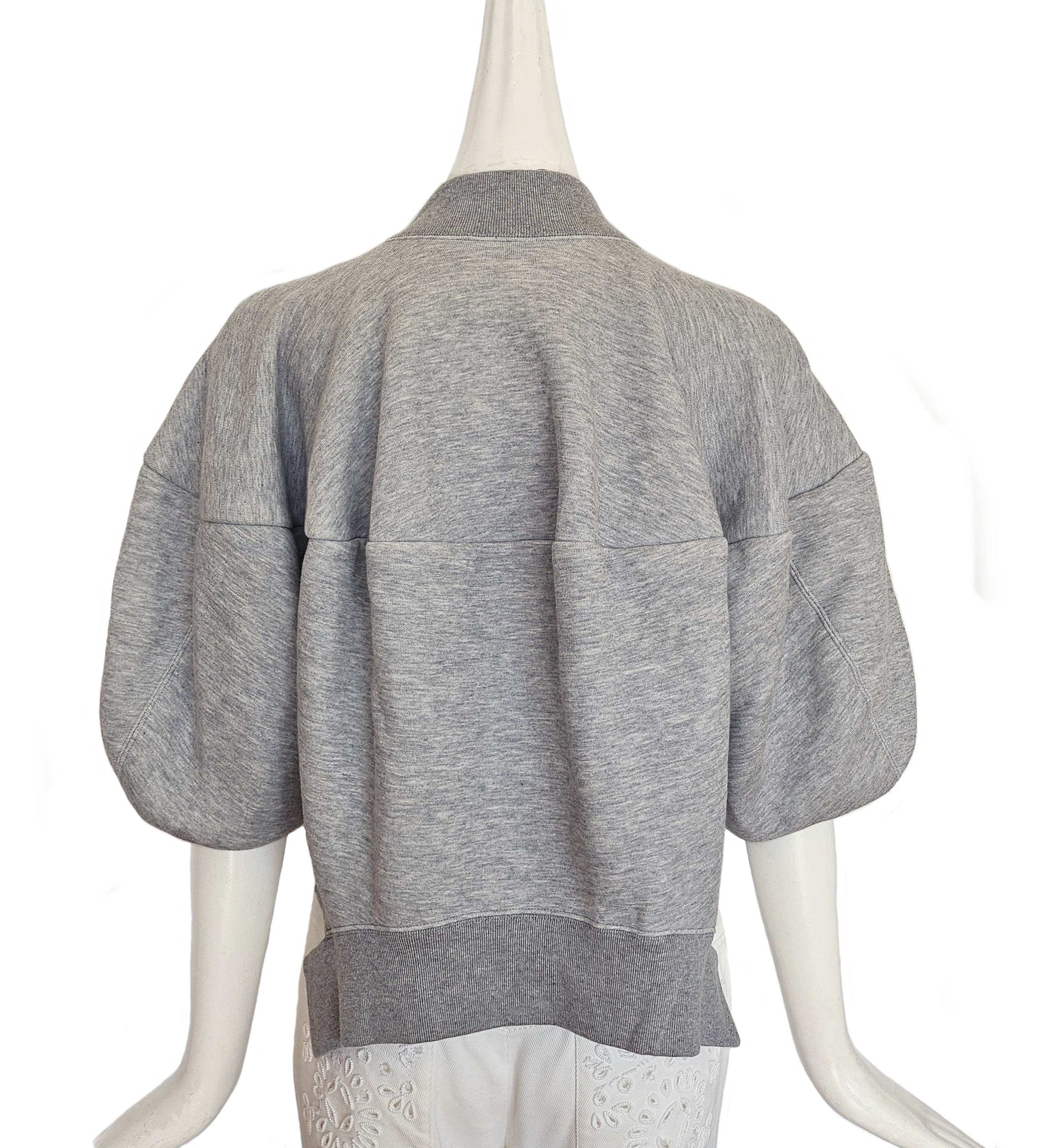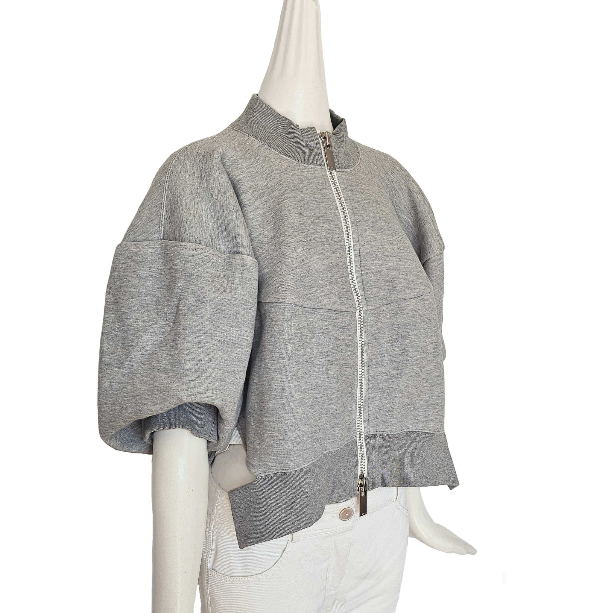 Crafted from blended cotton fleece, the jacket features puff sleeves, drop shoulders, slit sides with snap button closure, two way front zipper closure.