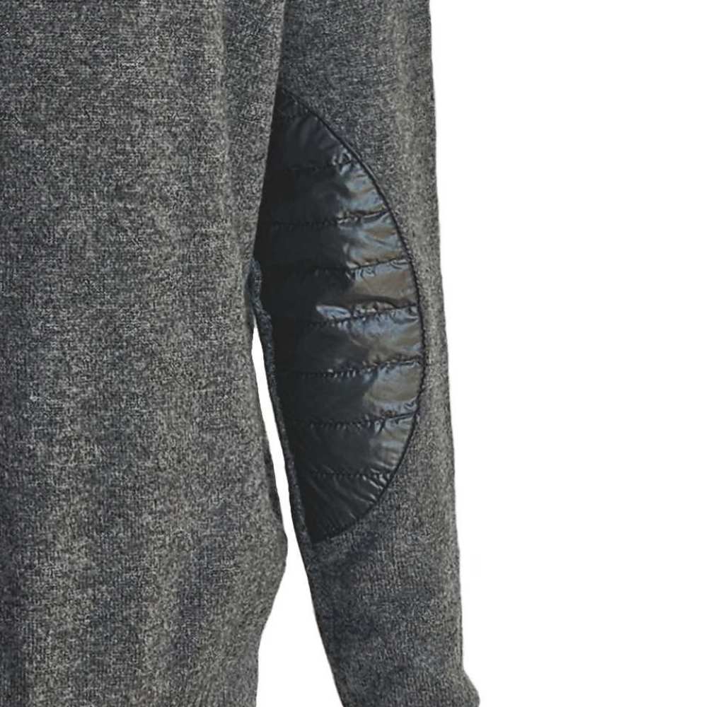 This buttery soft cashmere sweater features turtleneck, ribbed neck, cuff and hem and longer back. Duvet and feather filled patches at both elbows.