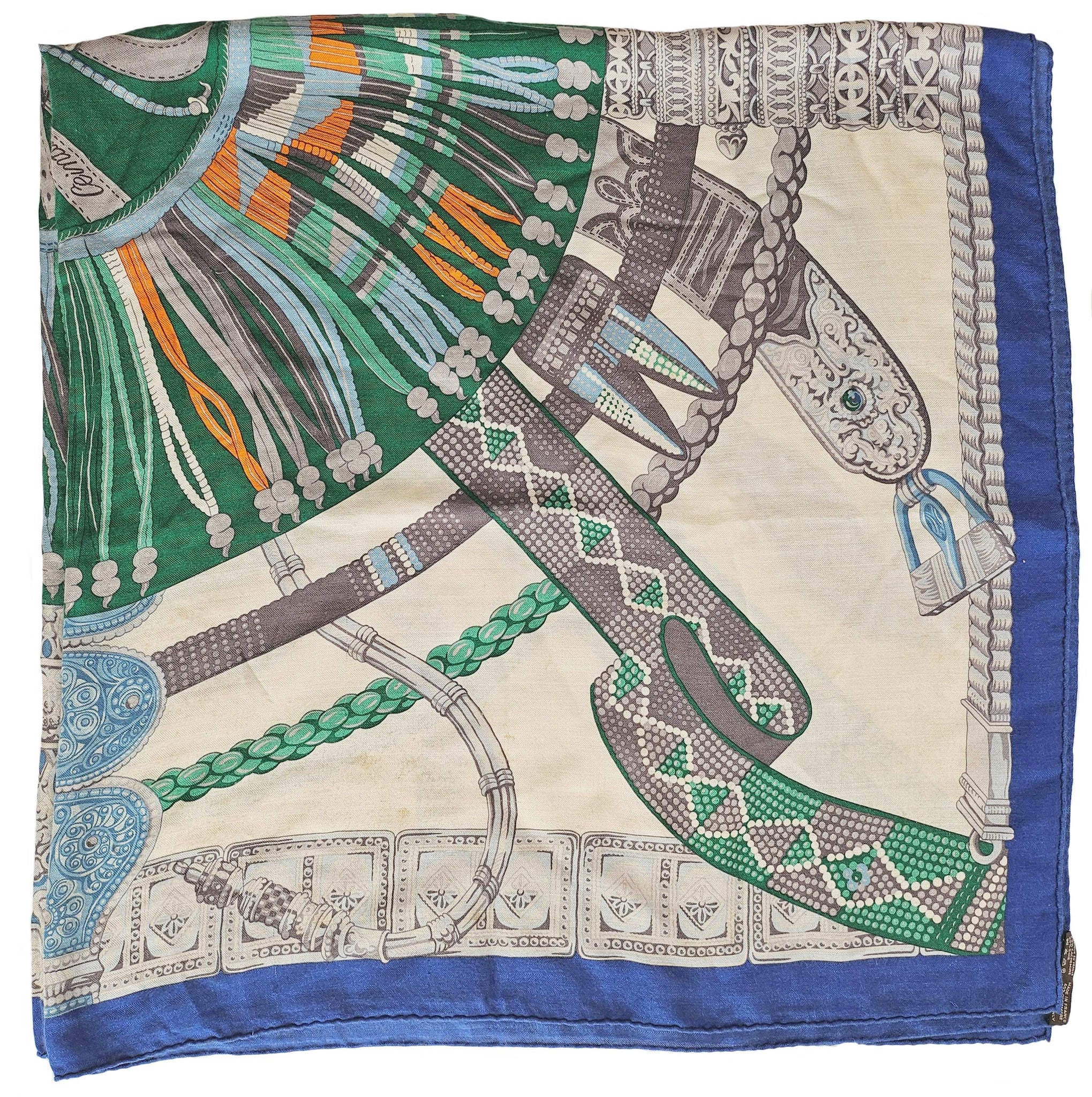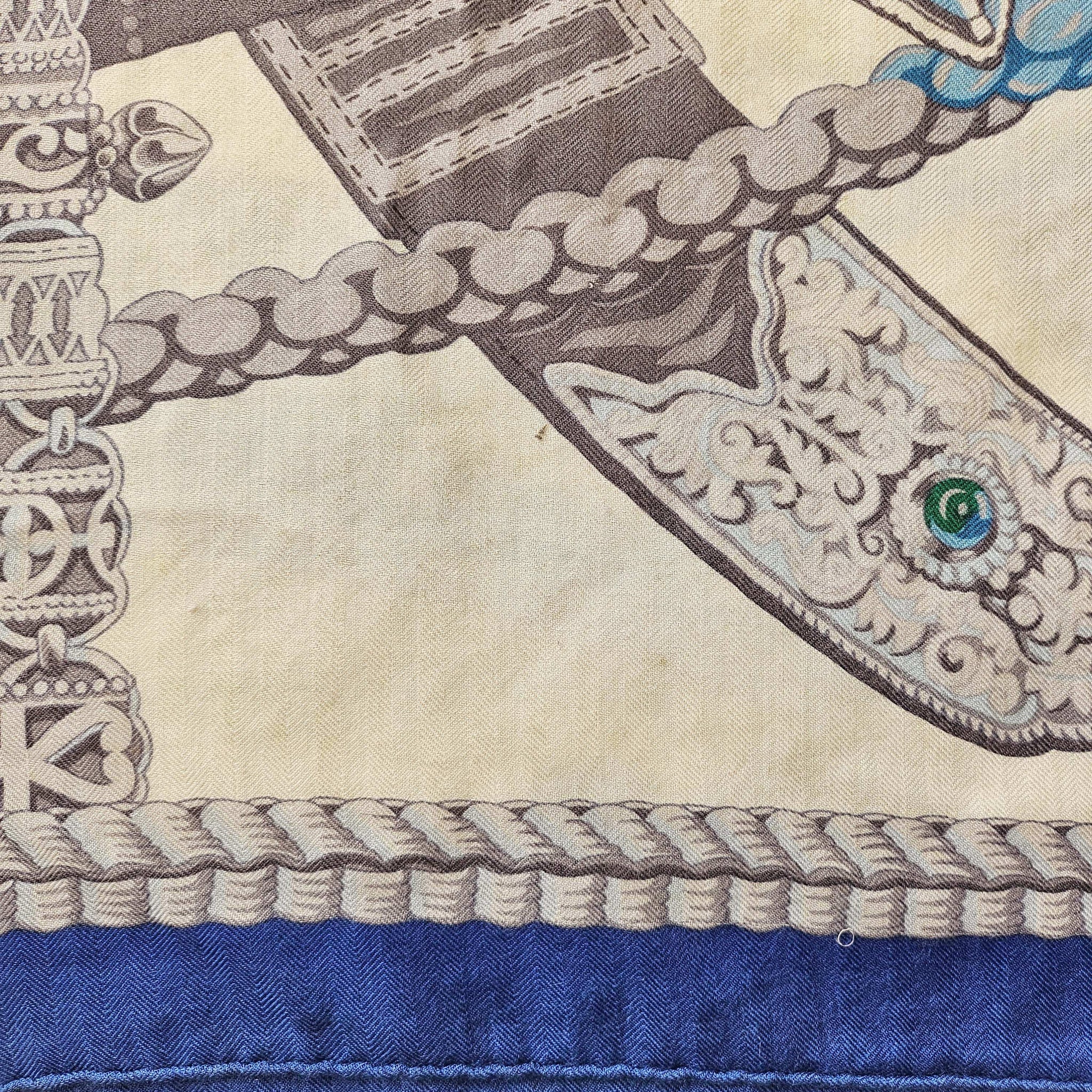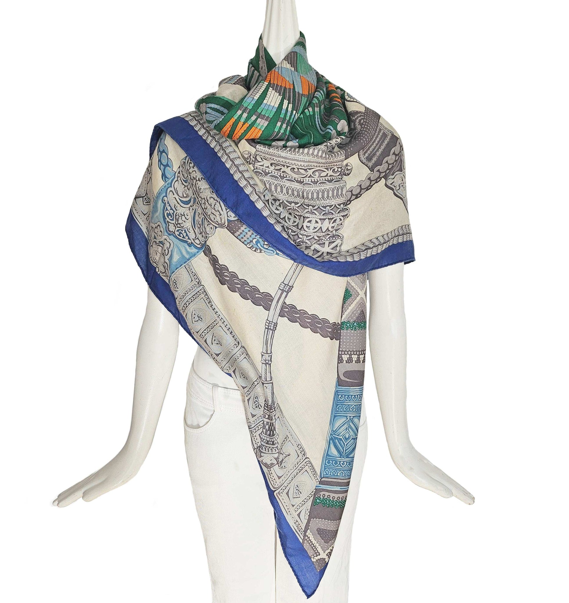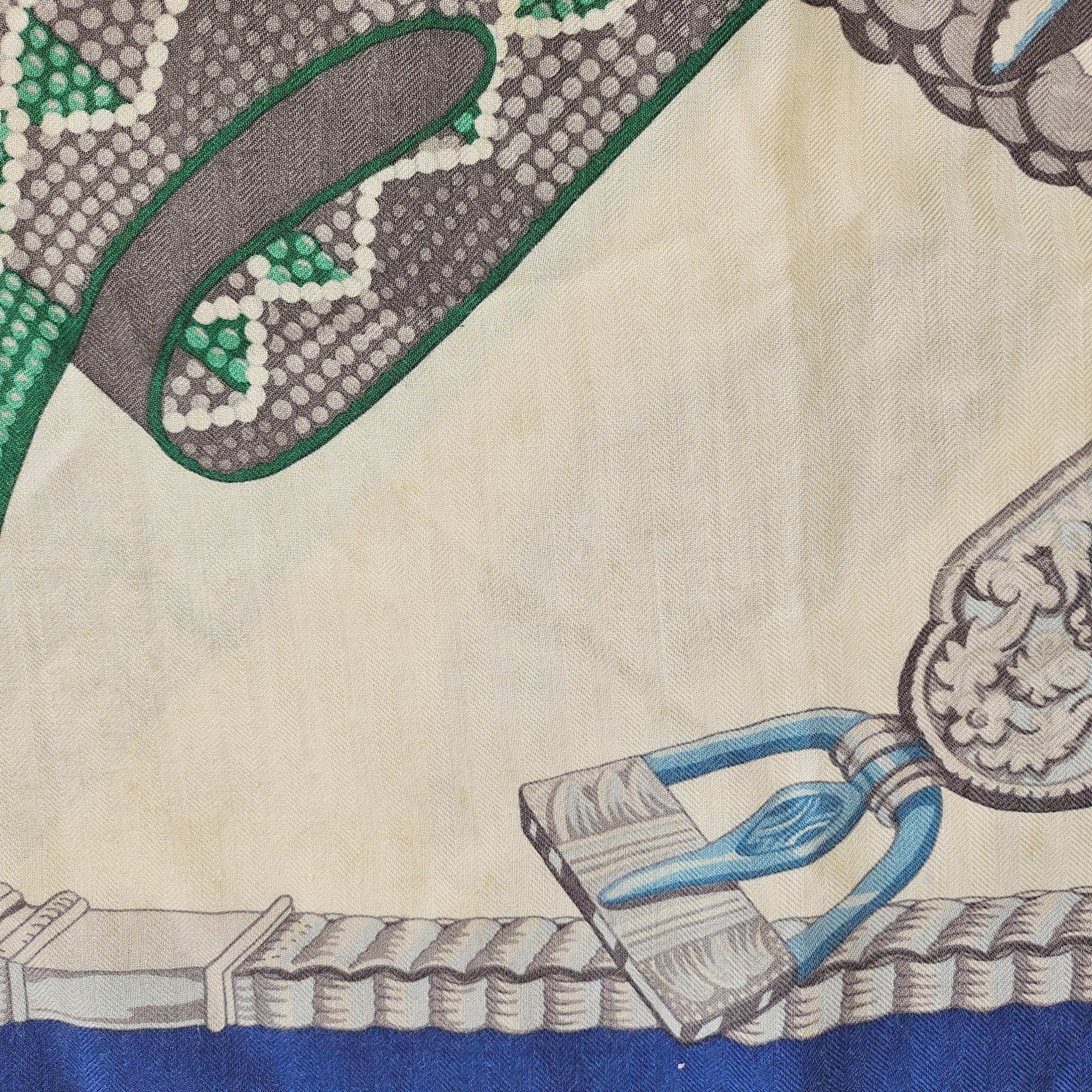 Condition: Signs of wear with stains throughout and some pills and pullsThe cashmere blend shawl by Laurence Toutsy features pattern in royal blue, off white, green and gray.