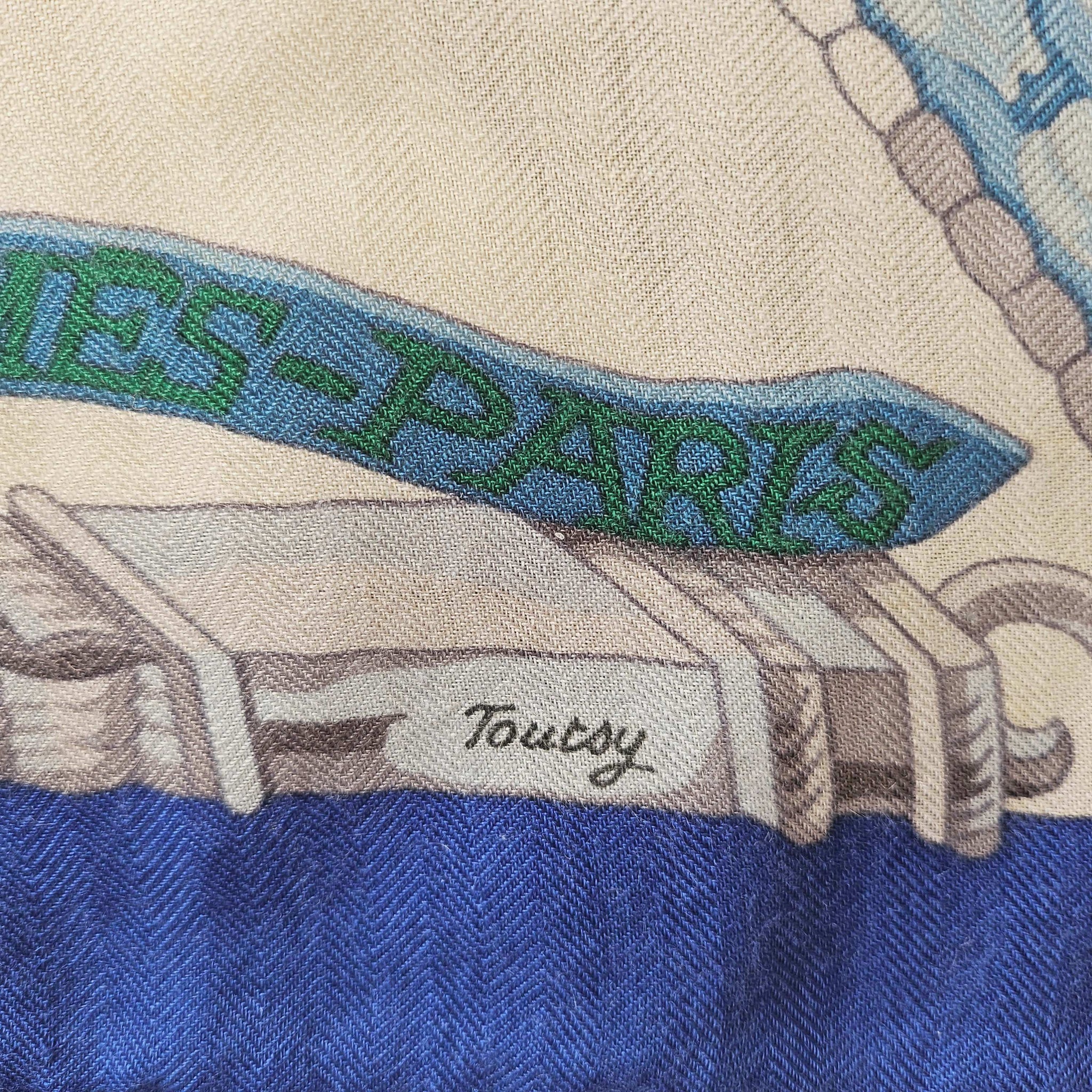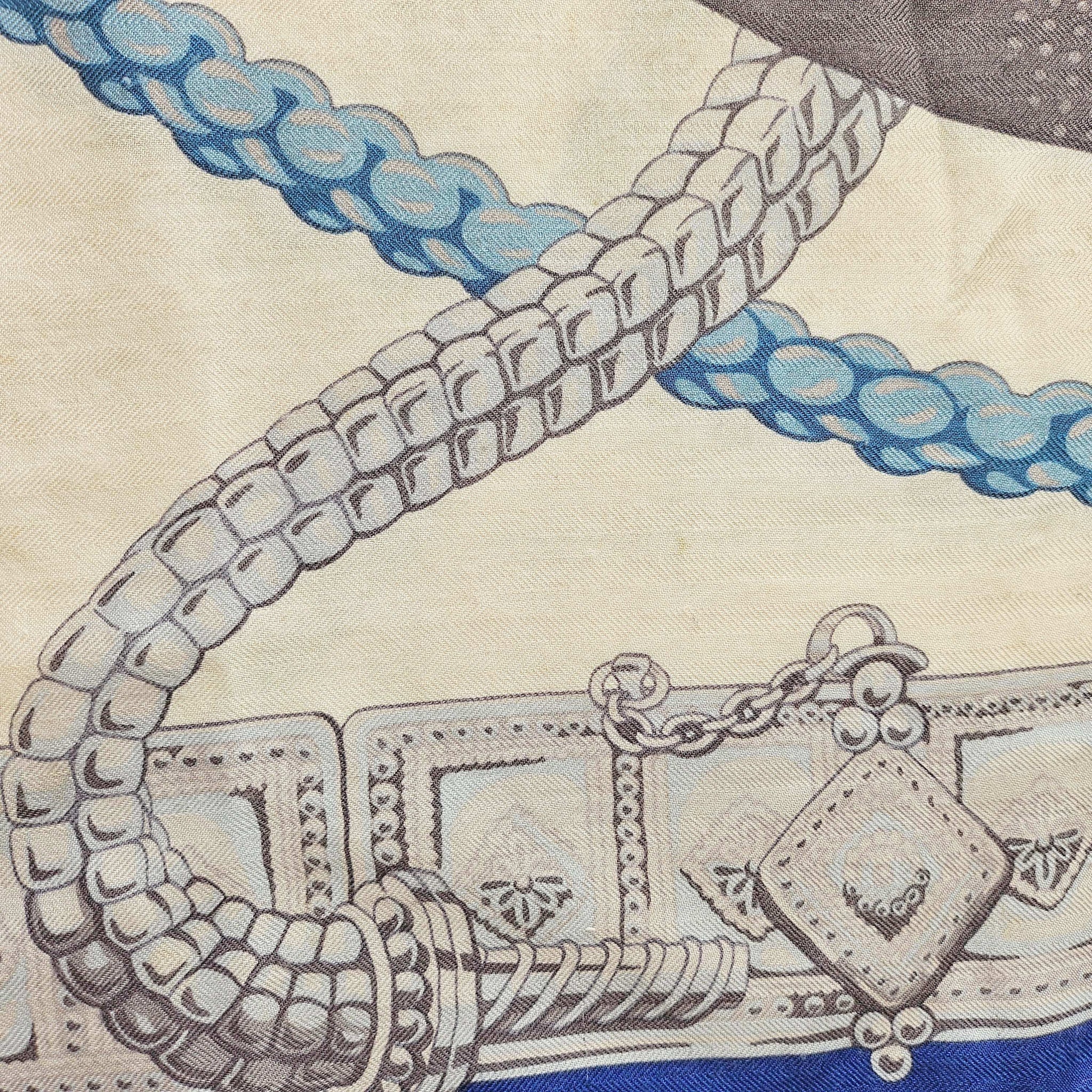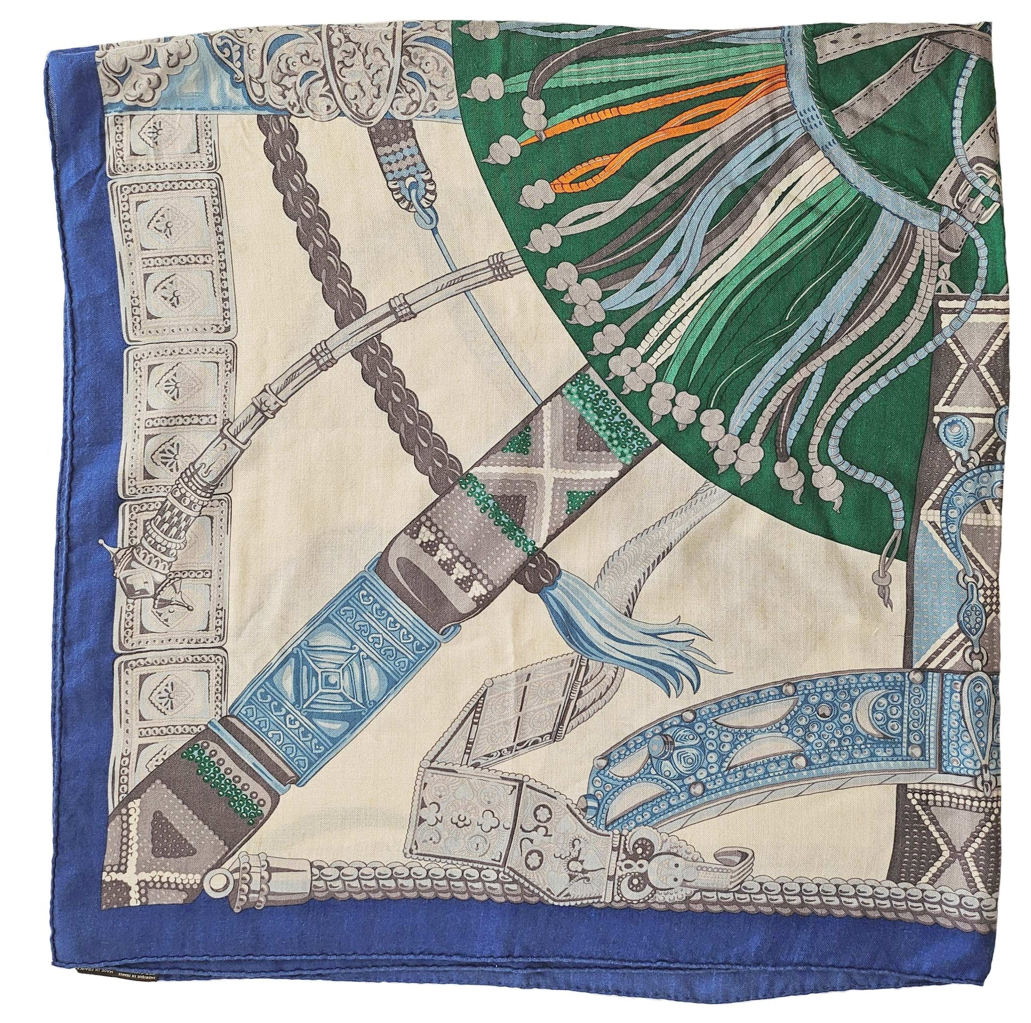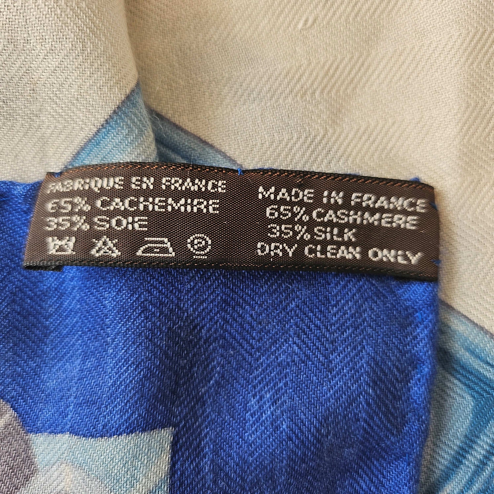 Condition: Signs of wear with stains throughout and some pills and pullsThe cashmere blend shawl by Laurence Toutsy features pattern in royal blue, off white, green and gray.