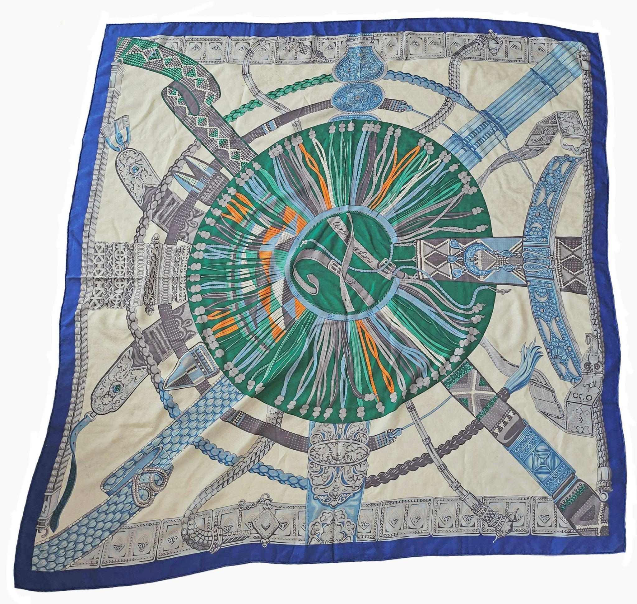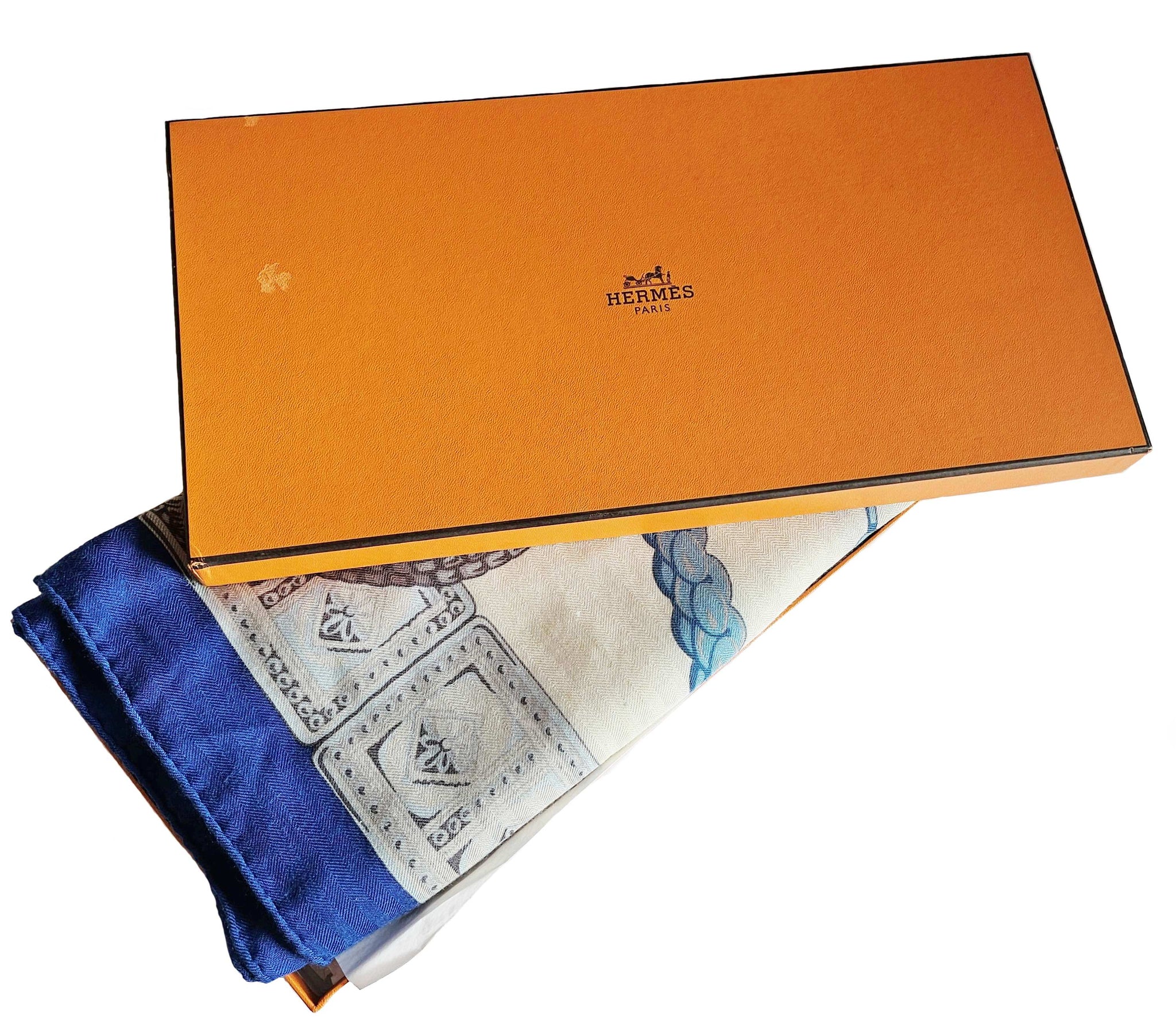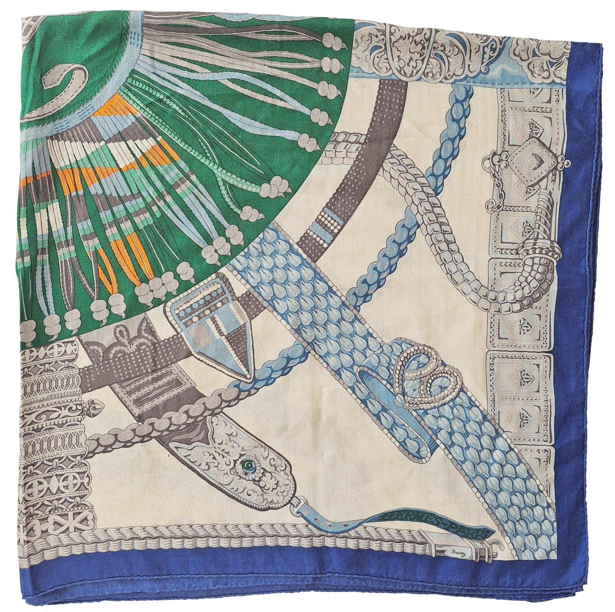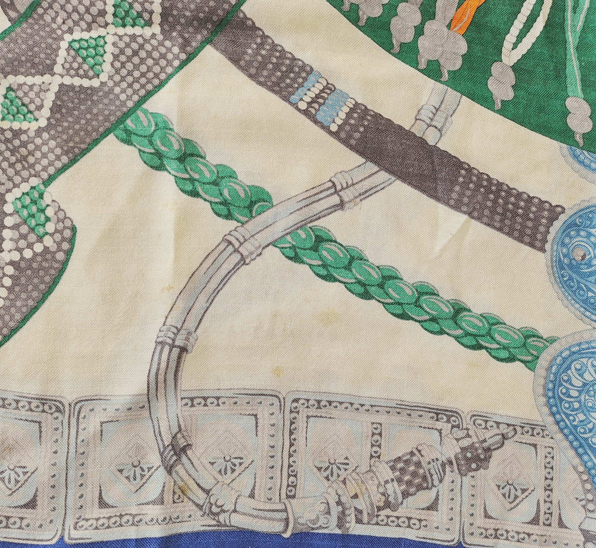 Condition: Signs of wear with stains throughout and some pills and pullsThe cashmere blend shawl by Laurence Toutsy features pattern in royal blue, off white, green and gray.