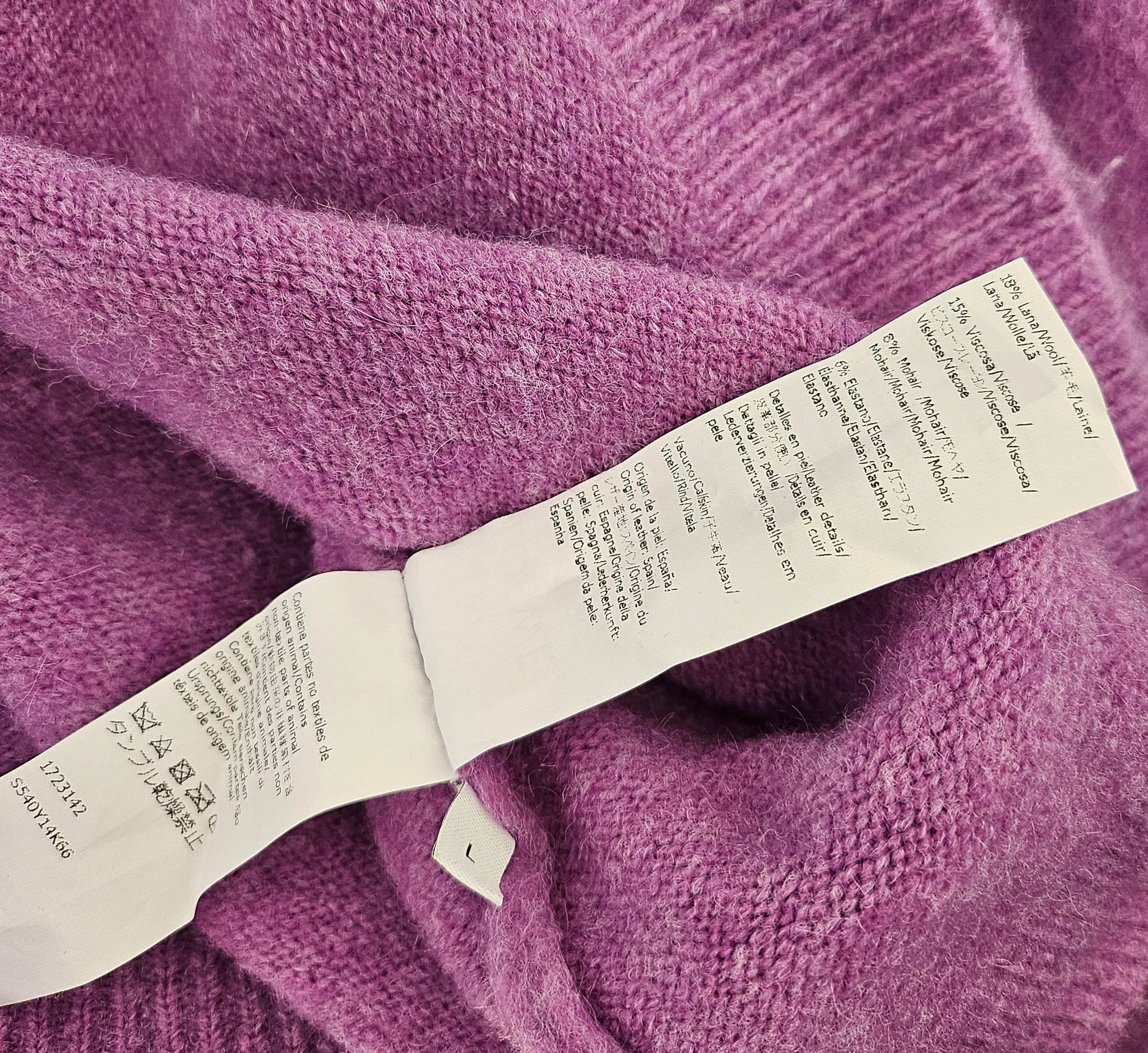 Crafted from medium weight wool mohair with graphic intarsia print.  An embossed calfskin logo tab at back.