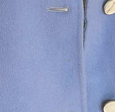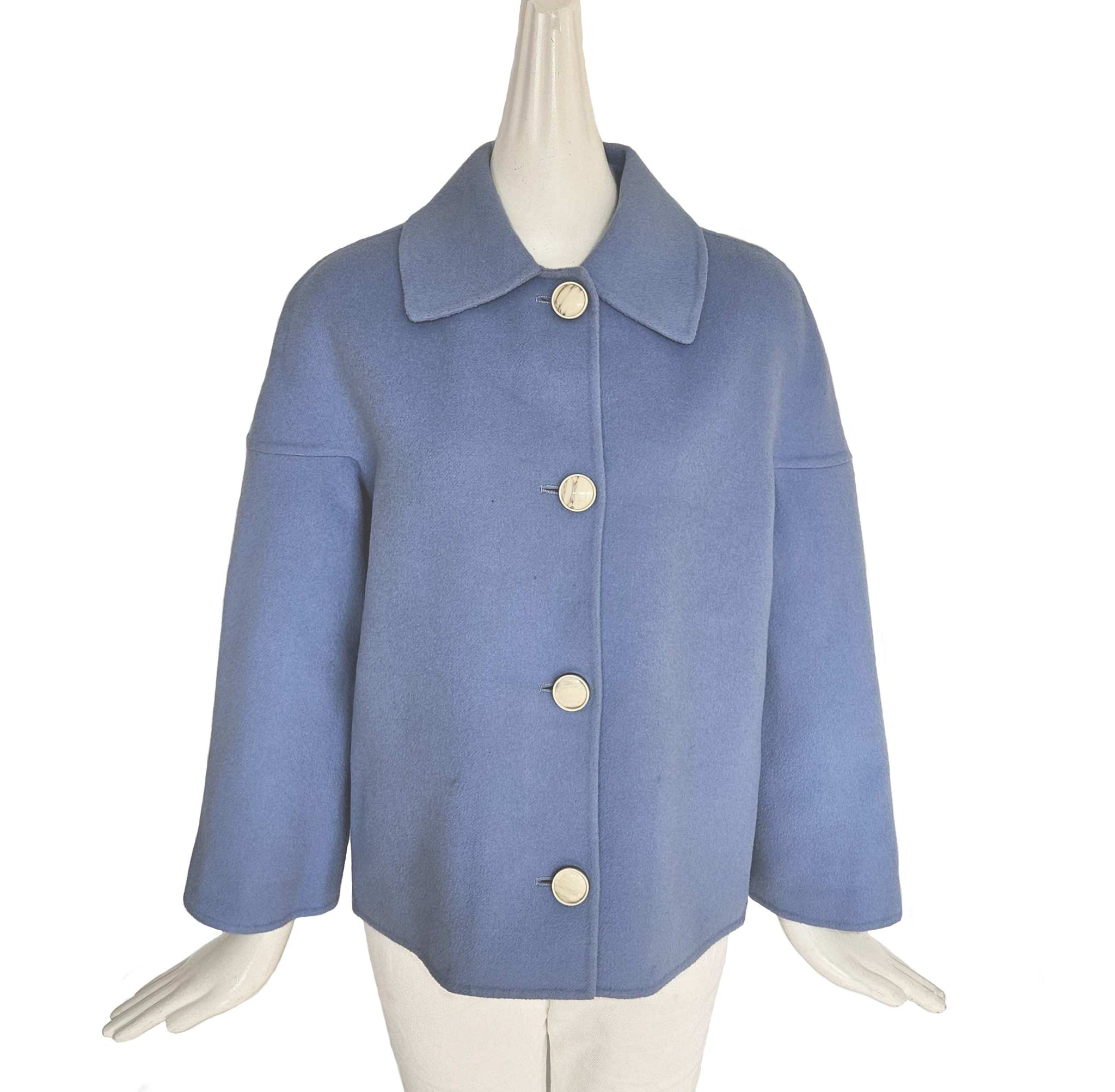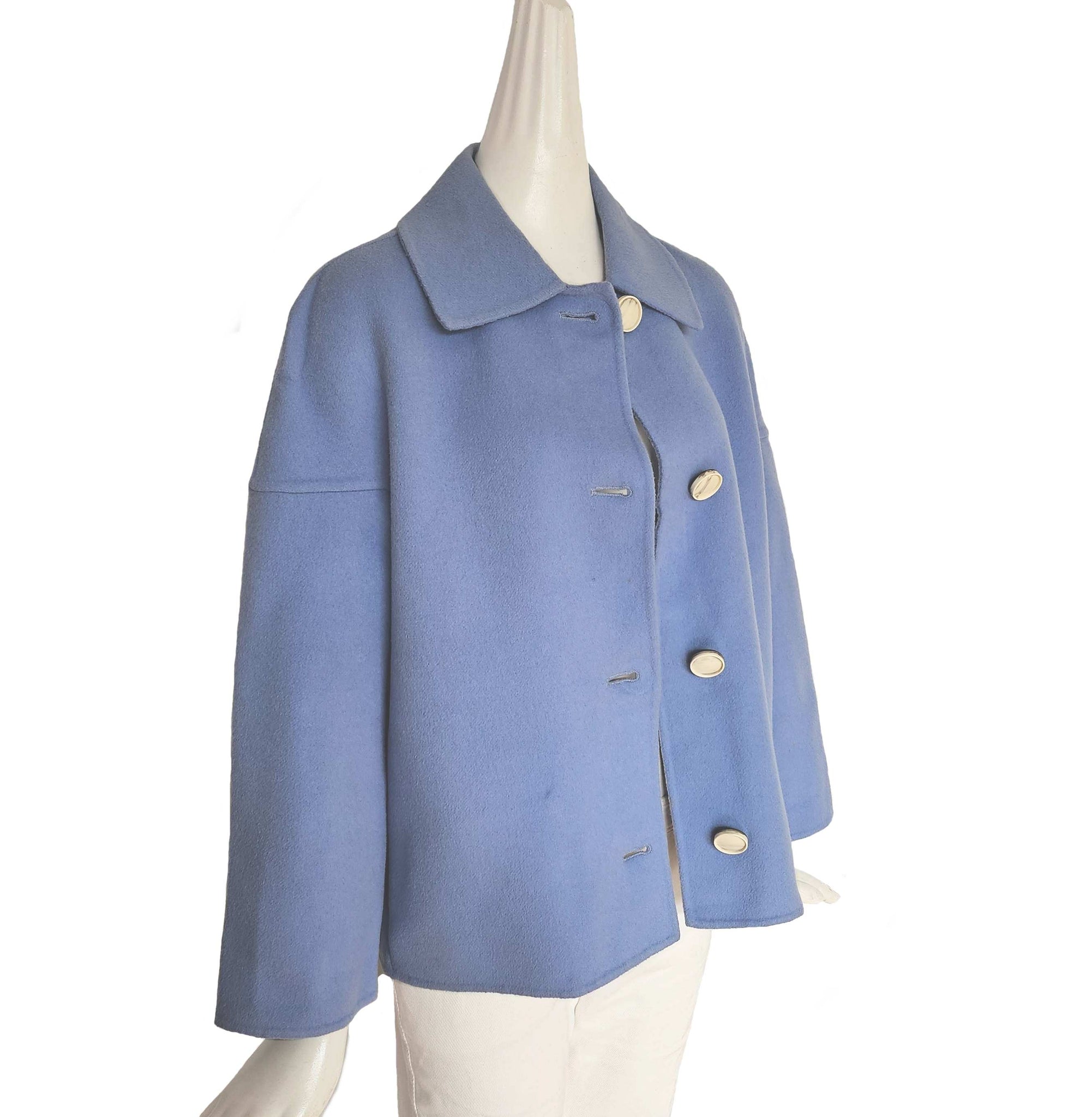 A powder blue short coat with dropped shoulders, spread collar and two side pockets on seams. Front button closure.