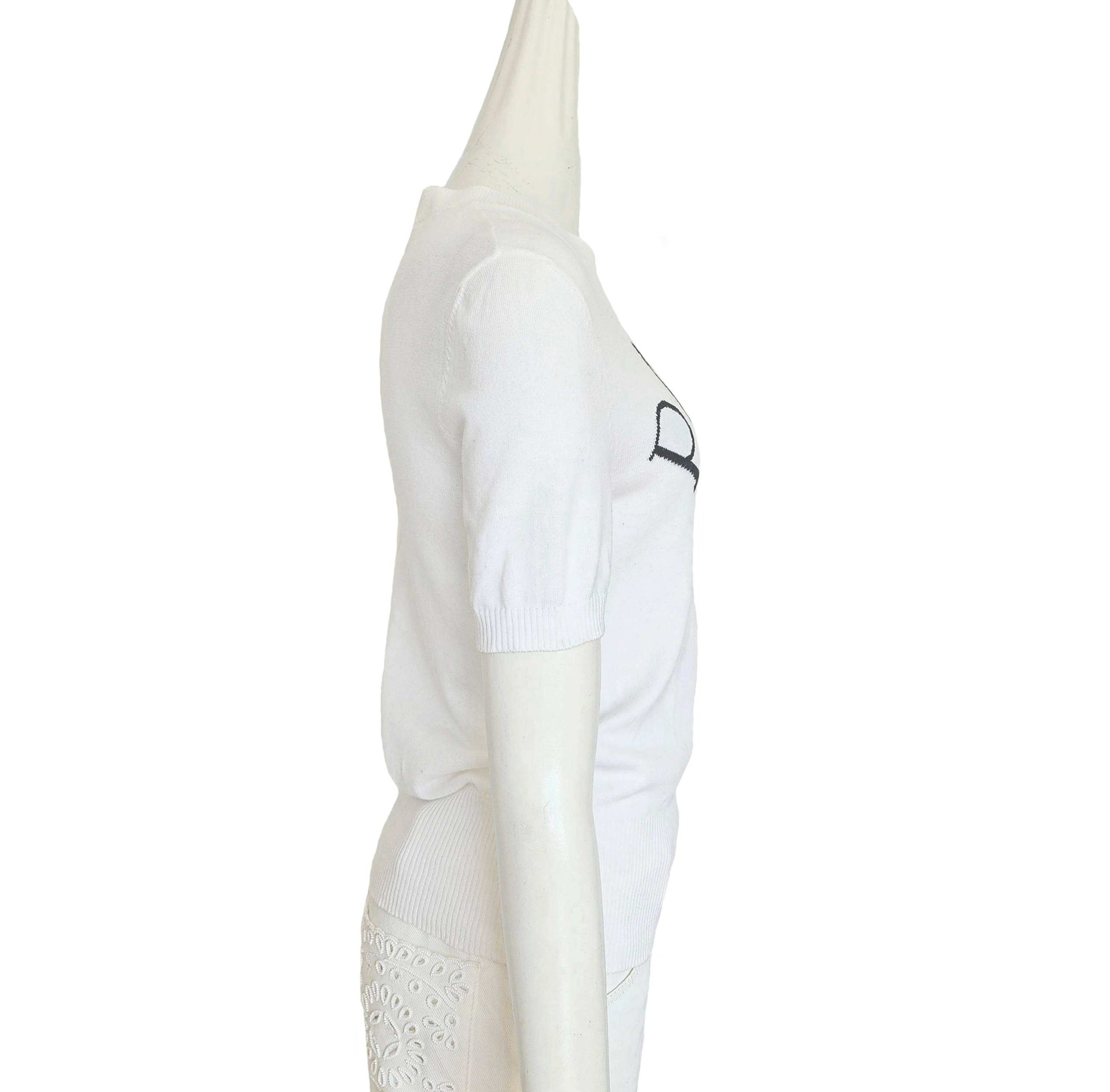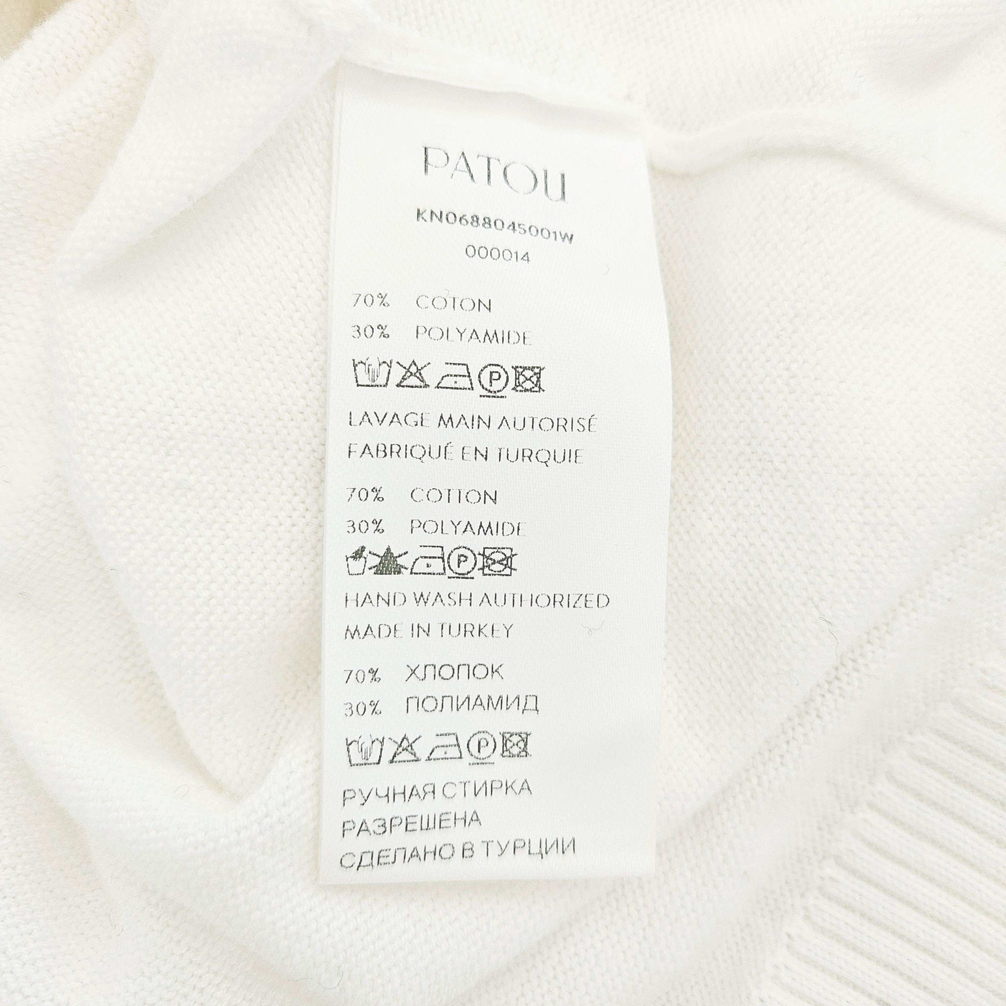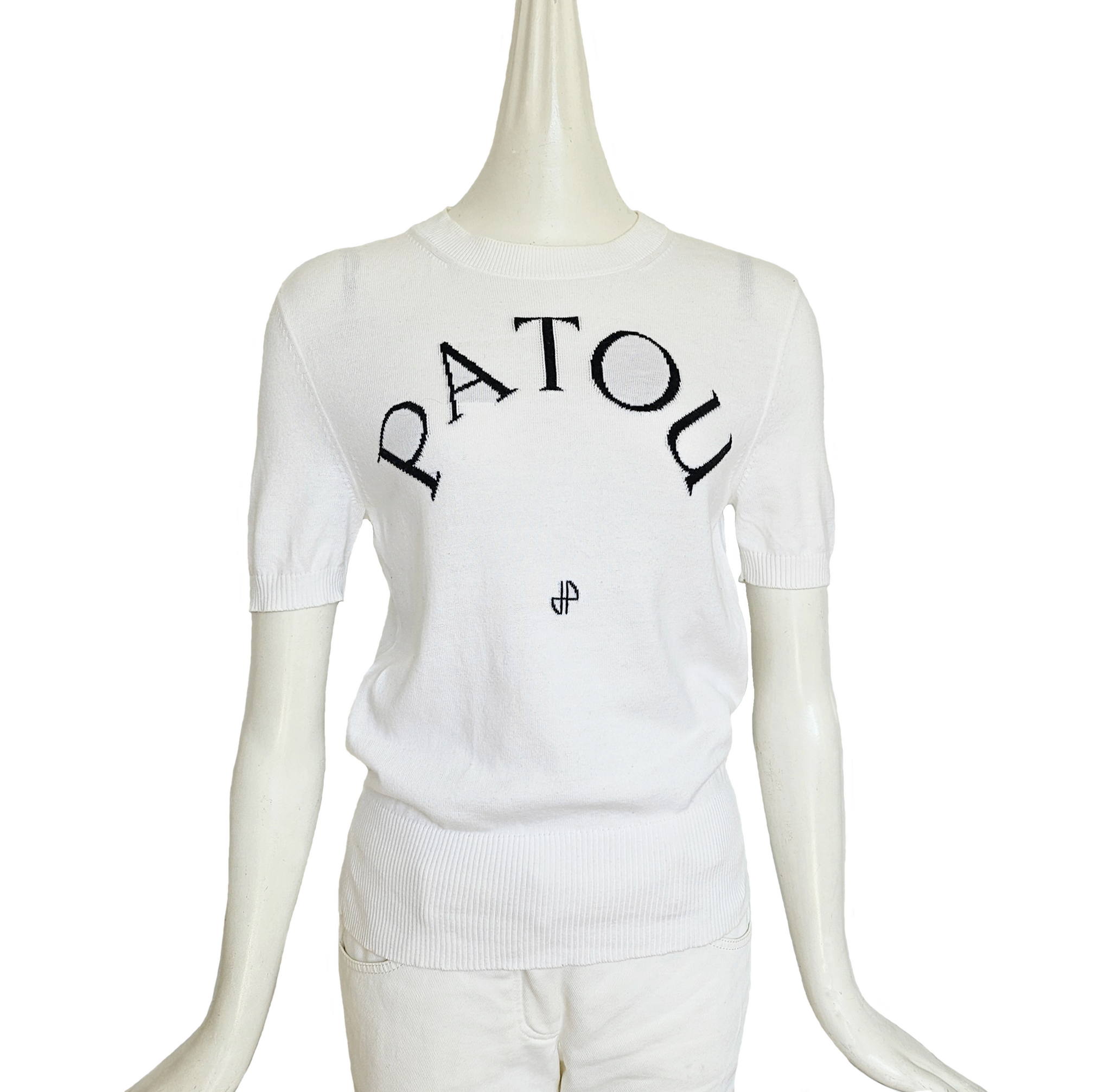 White cotton blend knit top with short sleeves, round neck, ribbed collar, cuffs and hem. Patou logo and monogram jacquard in black at front.